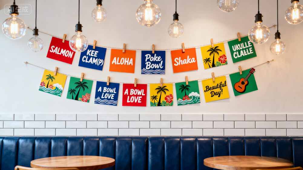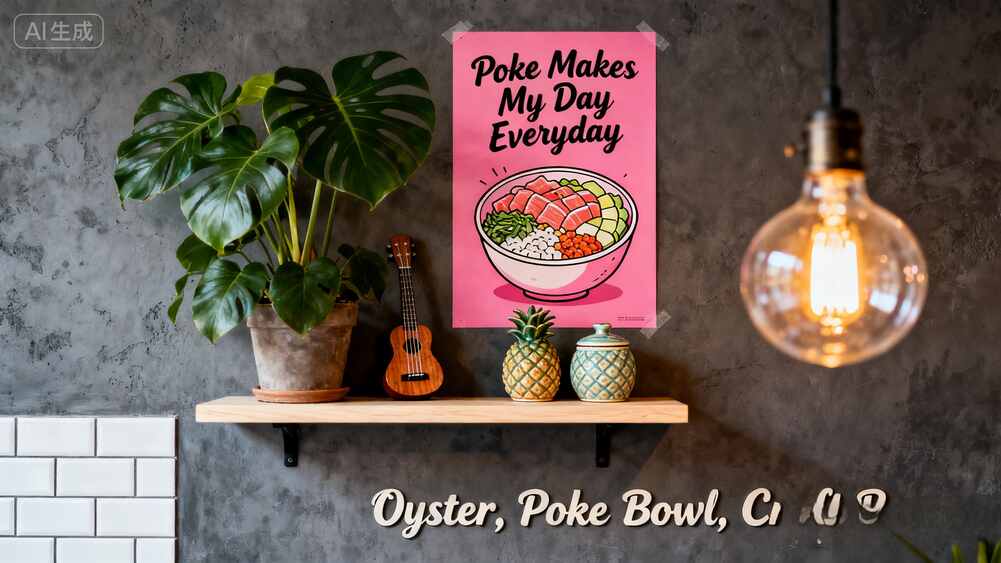 墻上那張海報才是靈魂所在!"Poke Makes My Day Everyday"這句話簡直寫到打工人心坎里了,配上誘人的波奇碗圖片,看著就讓人食欲大開。右上方那個復古燈泡更是點睛之筆,暖黃光線灑下來,連水泥墻都變得溫柔起來。