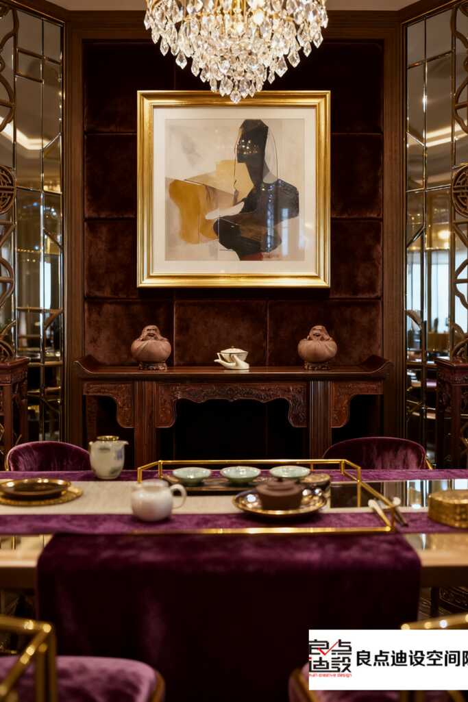 一進門,整個空間的基調就被定下了。深色實木桌椅是骨架,穩得住場子。但妙就妙在,設計師給每把椅子都“穿”上了酒紅色的絲絨坐墊!絕不絕?木質的中式感還在,但絲絨的貴氣和慵懶感一下子漫出來了,坐上去感覺不是來喝茶,是來談一場風花雪月的。