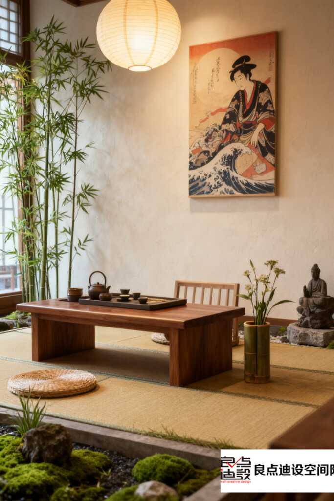 咱們直接看實景圖。核心區域就是這個榻榻米茶席,一眼定乾坤。沒有選用傳統中式的厚重桌椅,而是用原木矮桌搭配榻榻米,視覺上瞬間放松,也拉近了人與人的距離。一位身著旗袍的小姐姐跪坐泡茶,這個畫面本身就是動態的陳設——傳統服飾與場景融為一體,故事感立馬就有了。