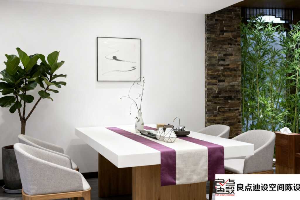 看中心這張白色大桌子,質(zhì)感溫潤,線條干凈利落,是現(xiàn)代設(shè)計的基底。但妙就妙在上面這條紫色桌旗,色彩一下子跳脫出來,高貴又神秘,瞬間打破了純白的寂靜,成了視覺焦點。桌上的精致茶具是傳統(tǒng)的語言,而旁邊那幾個幾何金屬小擺件,就是設(shè)計師悄悄埋下的現(xiàn)代伏筆。這種碰撞,一點不突兀,反而讓“中式”變得時髦、可親近。