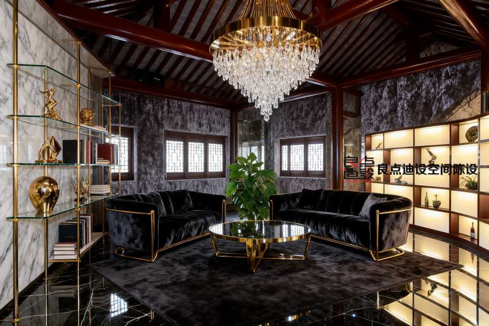 誰說傳統茶樓只能走中式復古風?這家空間直接讓東方古韻和輕奢摩登來了場***碰撞。坡屋頂下掛水晶燈,深色絨面沙發配金邊線條,大理石墻面就像流動的水墨畫。你發現沒?綠植和木質格柵窗讓整個空間活了起來。
