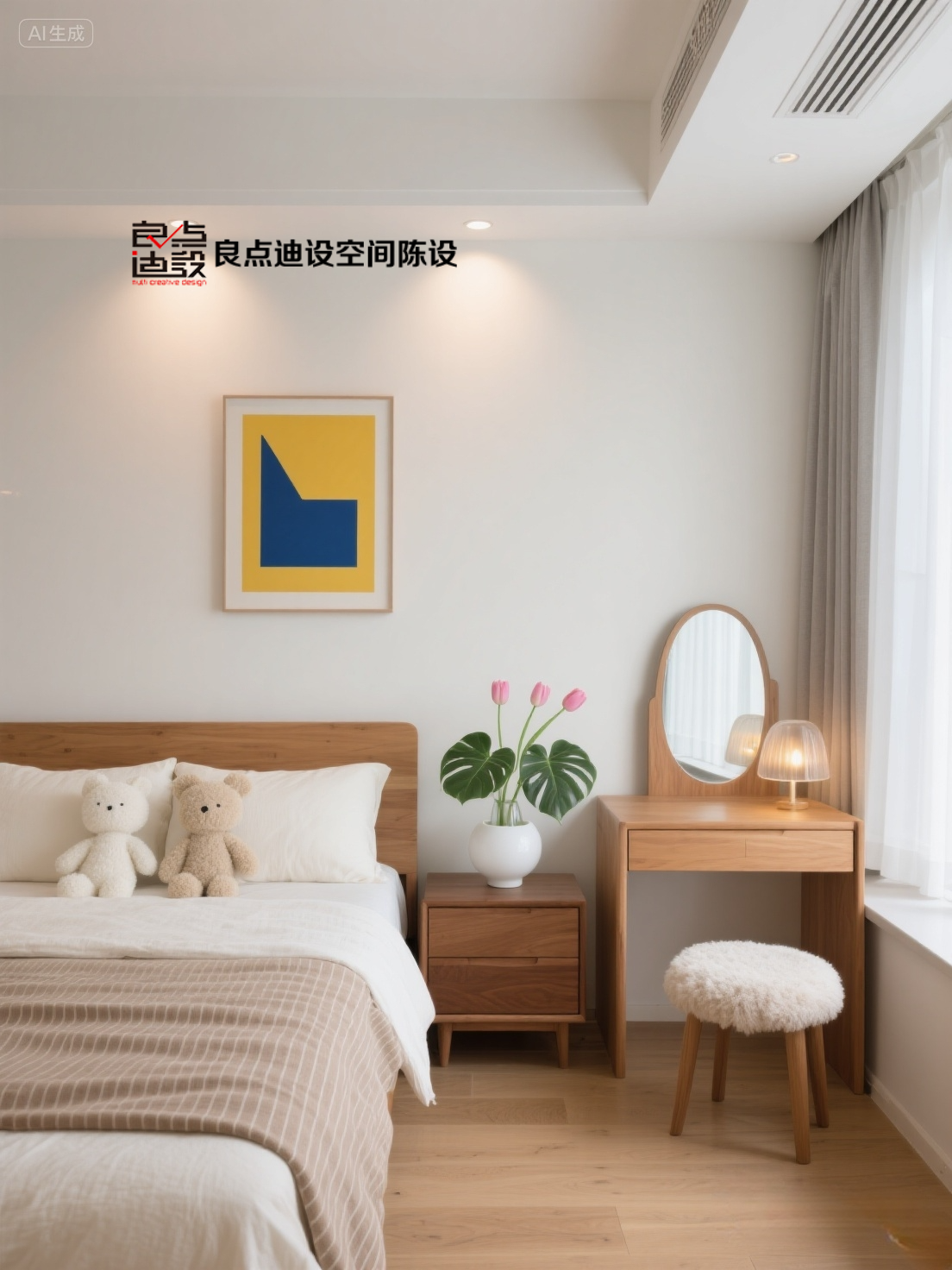 簡單清晰線條的原木大床加上同樣材質(zhì)的櫥柜,沒有過多的裝飾,透著一種樸素與自然。床背的墻上掛置著幾幅木質(zhì)鑲邊的簡單的花草畫,隨意而自然,一種悠然閑適的生活意境。