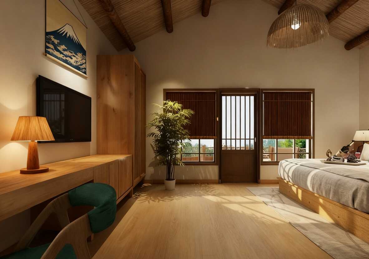 門窗設(shè)計(jì):推拉門和大窗戶太懂度假人啦!推開門就是戶外的小露臺(tái)(腦補(bǔ)一下擺個(gè)躺椅喝茶的畫面),竹簾一拉,隱私感和氛圍感同時(shí)get,這種把室外景色“框”進(jìn)房間的設(shè)計(jì),誰(shuí)看了不說(shuō)一句絕??