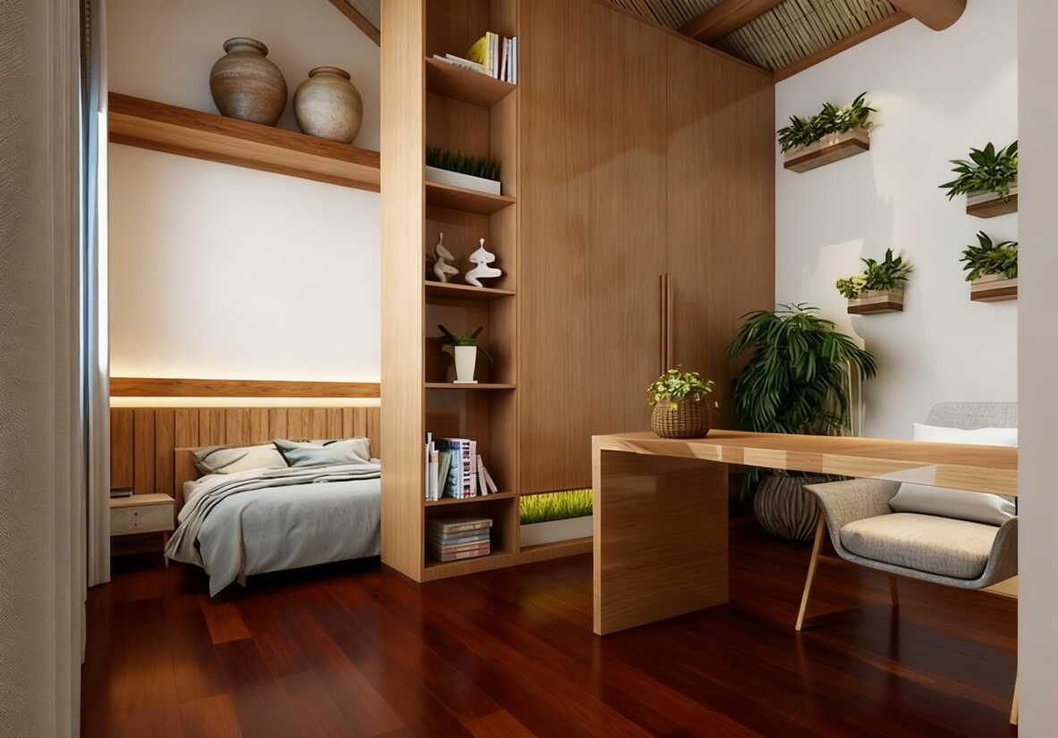 再看左邊的推拉門,日式格子設(shè)計(jì)+木質(zhì)邊框,不僅能分隔空間(比如后面可能是臥室區(qū)),還自帶“朦朧美”。陽(yáng)光透過(guò)竹簾照在門上,影子落在地上,瞬間就有了“侘寂風(fēng)”的氛圍感~這種設(shè)計(jì)超適合民宿,因?yàn)樗茏屝】臻g看起來(lái)更有層次,還能滿足客人“拍美照發(fā)社交平臺(tái)”的需求,畢竟現(xiàn)在大家住民宿,一半是為了體驗(yàn),一半是為了打卡嘛~